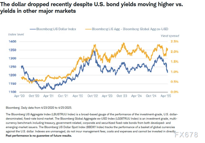核心矛盾在于,此次美元贬值发生在“美债利差仍处高位”的非常规背景下。从经典汇率定价逻辑看,利差是驱动汇率的核心变量:当美国利率高于其他经济体时,资本会涌入美债市场,推升美元需求进而支撑汇率。