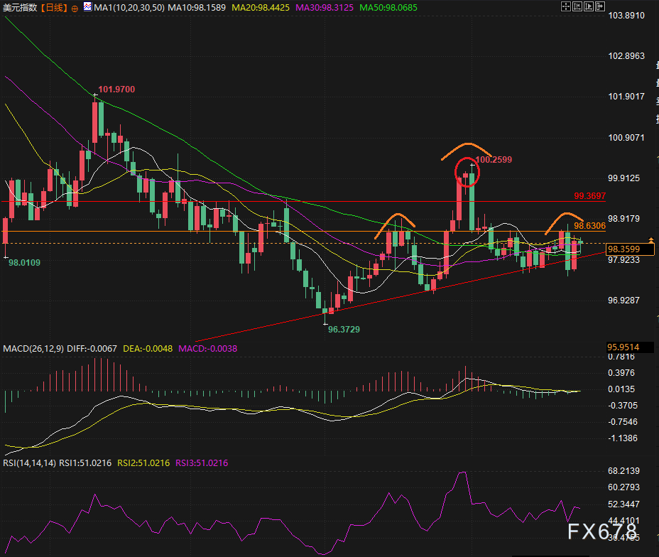 美元指数在超过99.36之前均受8月1日黄昏之星压制,目前支撑位随趋势线抬升也是大形态的颈线,第一压力位为98.63,为多日收盘价。MACD和RSI都在多空分界线附近。交易员需关注近期美国将发布的7月核心PCE物价指数与8月CPI,8月非农就业报告,特别是价格靠近颈线,寻找交易机会。